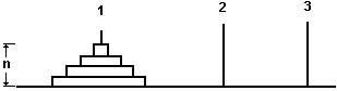 Рассмотрим задачу о Ханойских башнях. Имеются три стержня с номерами 1,2,3. На стержень 1 надето n дисков различного диаметра так, что они образуют пирамиду (см.рис.31). Написать программу для печати последовательности перемещений дисков со стержня на стержень, необходимых для переноса пирамиды со стержня 1 на стержень 3 при использовании стержня 2 в качестве вспомогательного. При этом за одно перемещение должен переноситься только один диск, и диск большего диаметра не должен помещаться на диск меньшего диаметра. Доказано, что для n дисков минимальное число необходимых перемещений равно 2^n-1.